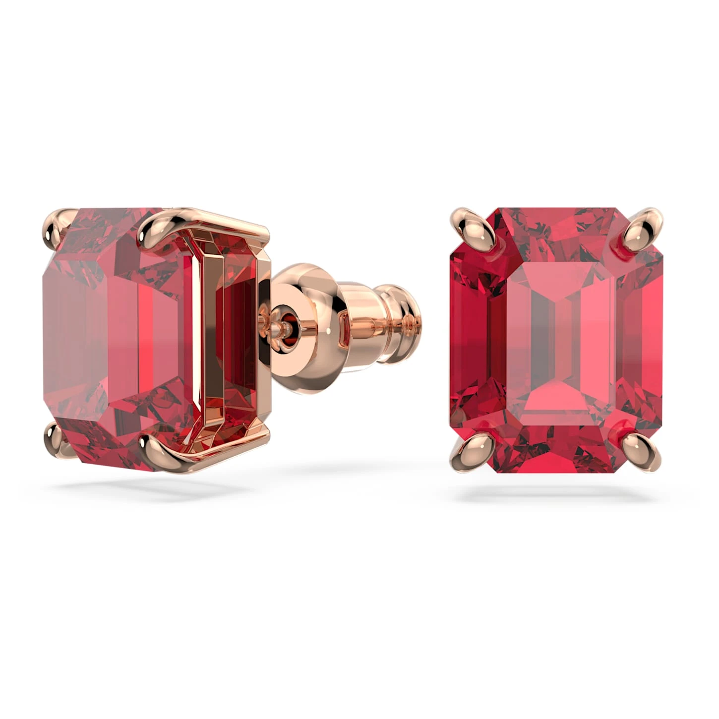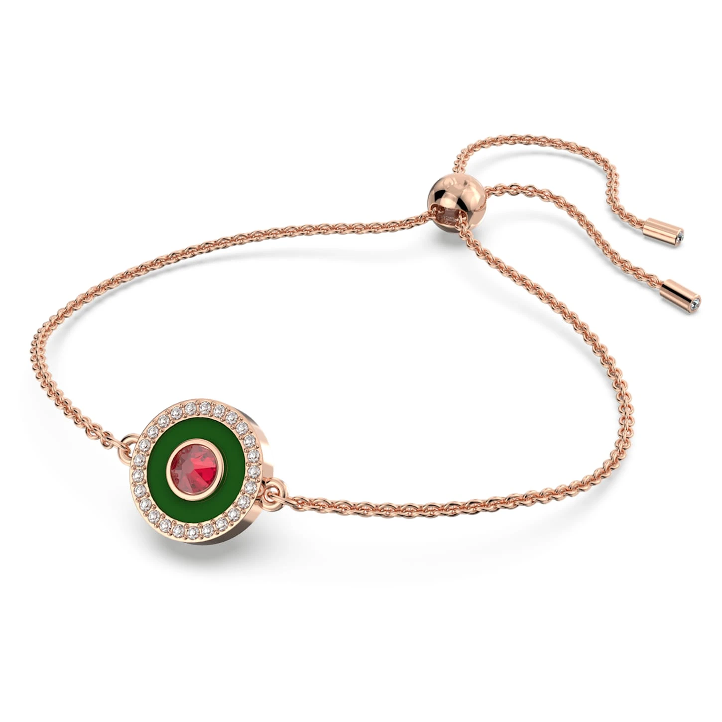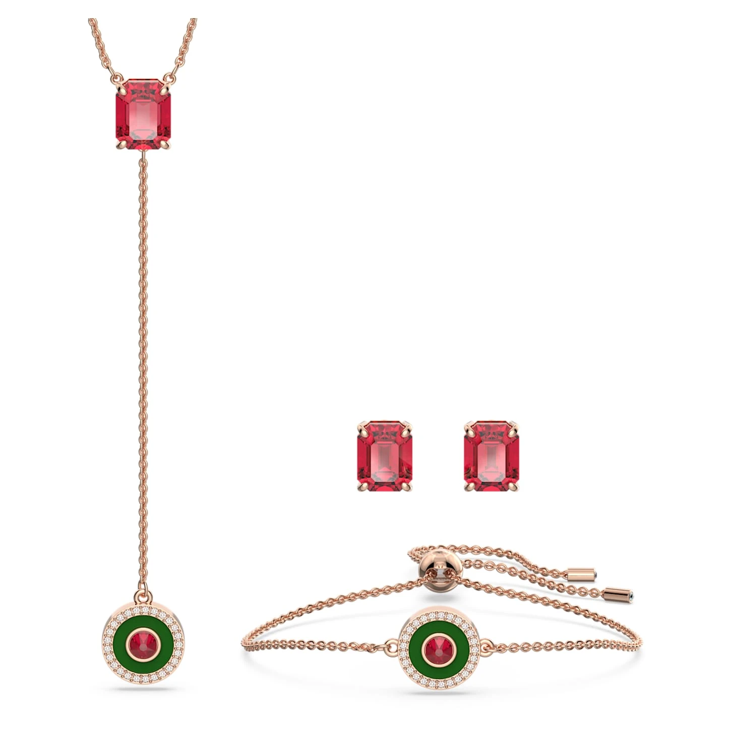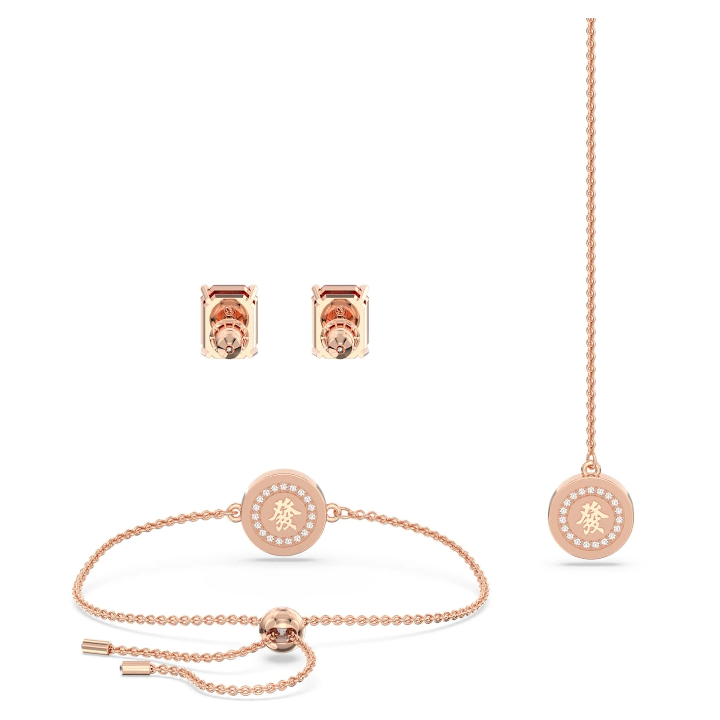 Achieve your own style harmony for Chinese New Year with this beautiful set containing a matching necklace, bracelet, and earrings. The rose gold-tone plated designs are distinguished by their auspicious red colorway and alluring combination of stones. The pendant necklace features an octagon-cut stone in red and a round pendant with clear pavé and a central red stone. The stud earrings also feature an octagon-cut red stone, while the bracelet mirrors the round motif on the pendant and includes a sliding closure for the perfect fit. Choose this set for instant wonder during the celebrations, or choose it as a gift for the Year of the Rabbit.