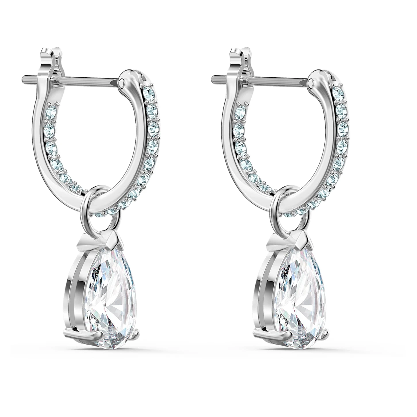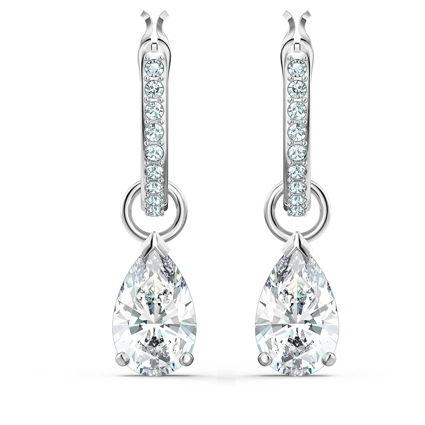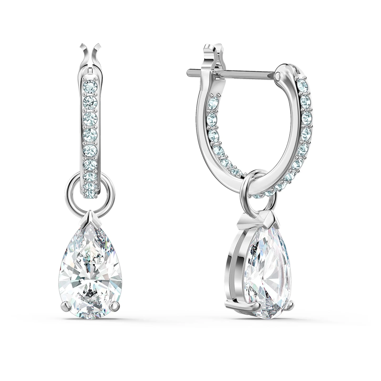This pair of pierced earrings by Swarovski offers beautiful versatility. Two parts make up each earring: A hoop adorned with sparkling pavé and a single, drop-shaped stone attached to them. Simply remove the dangling elements to create different looks. A great way to enhance everyday outfits.