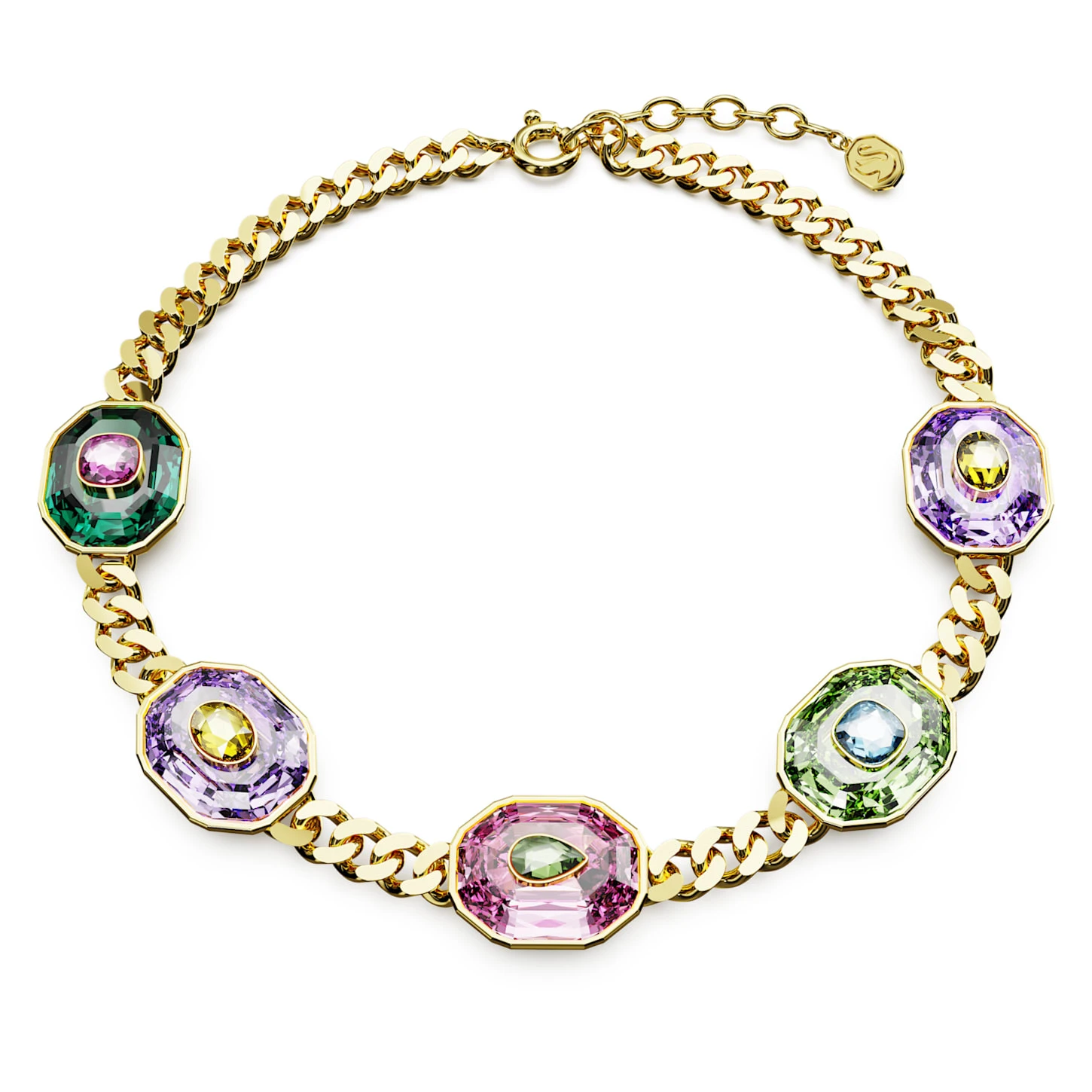 Surround yourself in vibrant color with this showstopping choker from the Chroma family. Set on a gold-tone plated link chain, the design features five octagon-cut stones in a variety of hues, each topped with a pear-shaped stone in a contrasting color. This gem-like jewelry is truly eye-catching and is the ultimate statement piece to wear day or night.
