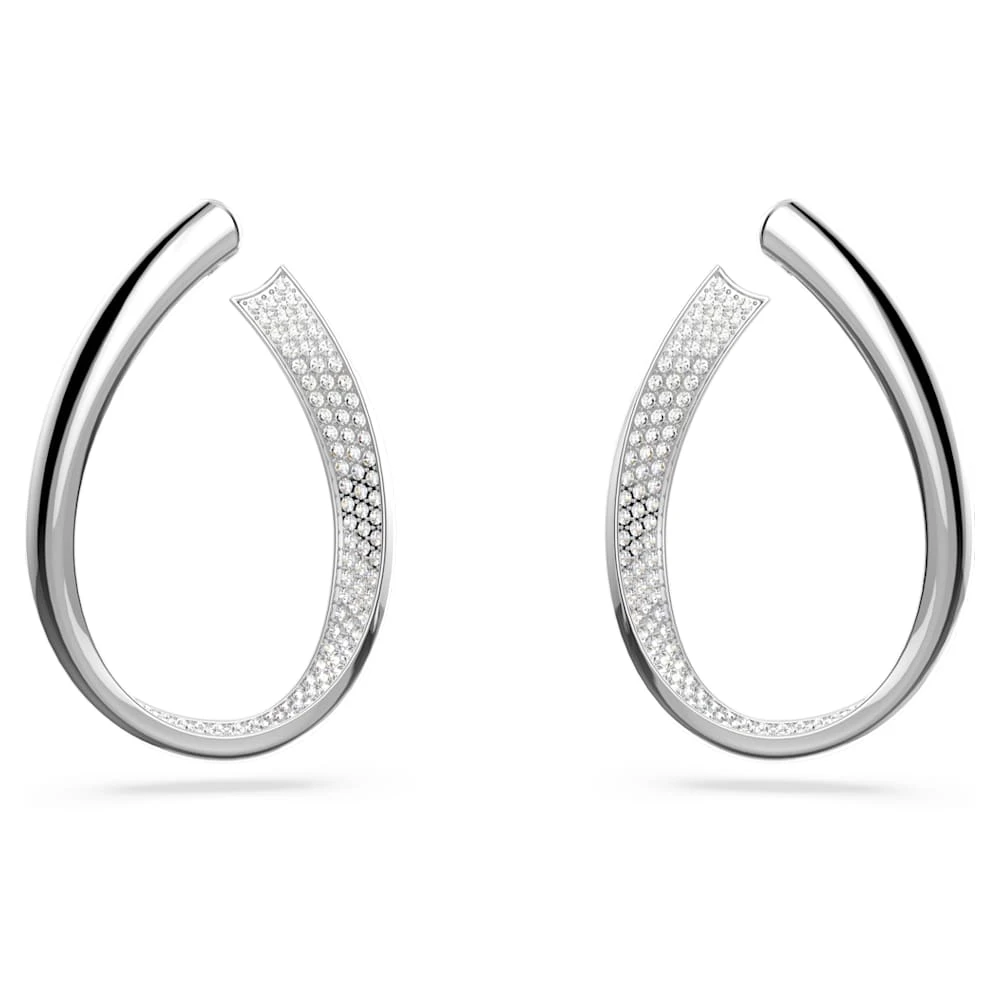 Designed to mesmerize, these hoop earrings are as versatile as they are eye-catching. Featuring a unique ribbon motif, they are adorned with white crystal pavé and finished with sleek rhodium plating. Day or night, dressed up or down, they adapt to the occasion.