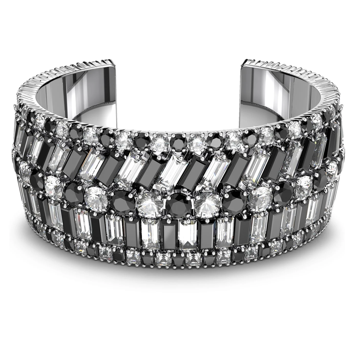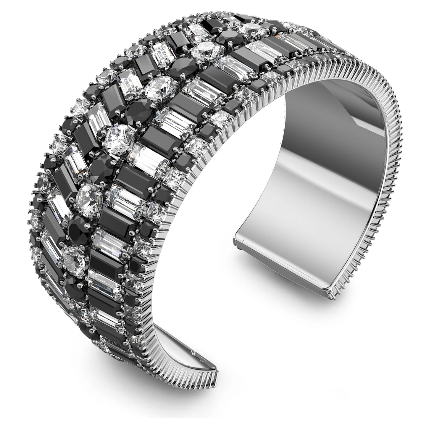 Prepare to spellbind with this statement cuff. Inspired by mathemagical patterns, it features black and white stones in a mix of contemporary cuts. Elegantly finished with a rhodium plated setting and hidden fastening, it will lend drama to any look.