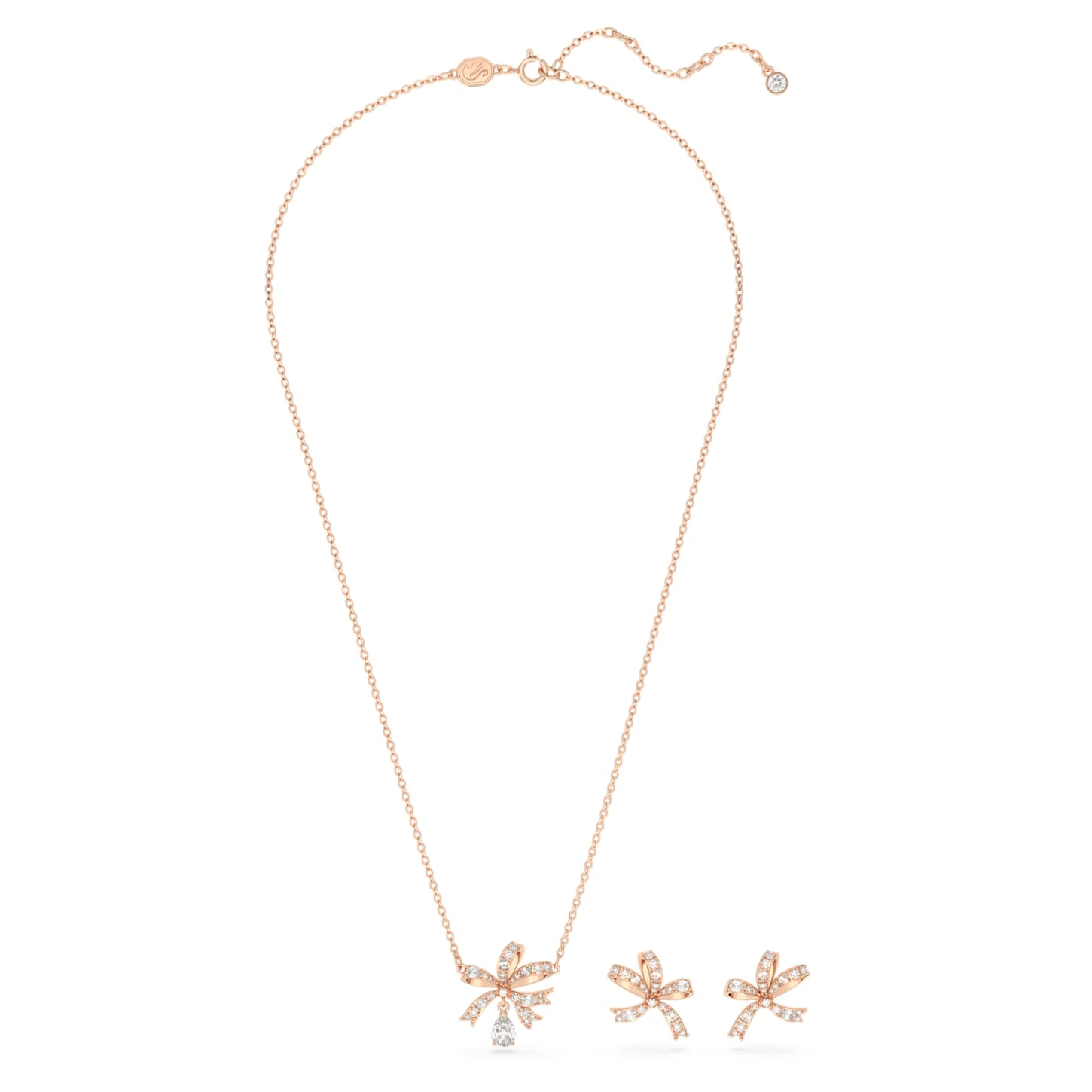 This graceful Volta jewelry set is the perfect way to streamline your style with elegance and sophistication. Including a rose gold-tone plated necklace and pierced earrings, each bow-inspired piece features a radiant selection of clear crystals set in place using the chattonage technique. The tied-up ribbon design makes it a perfect gift for any special occasion.