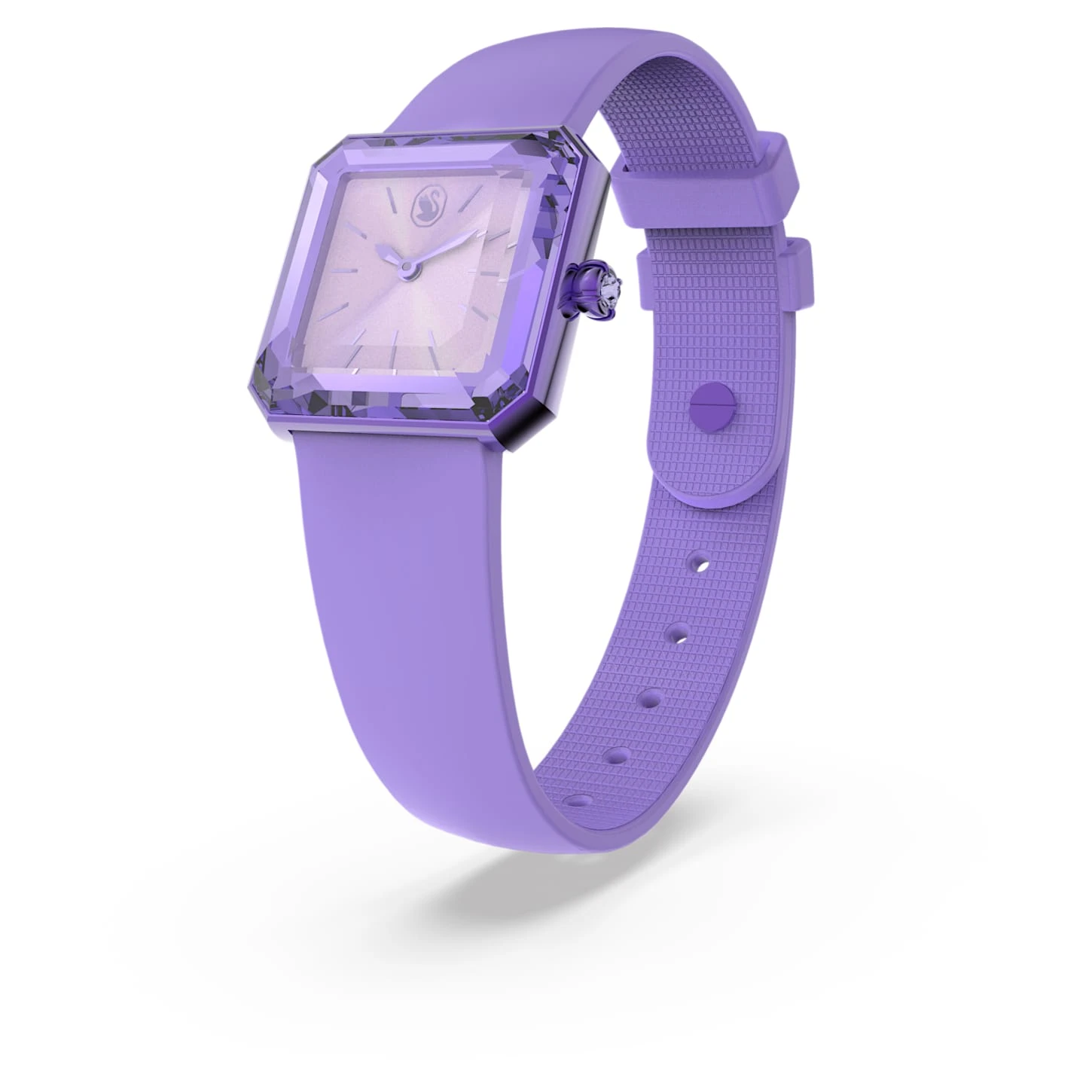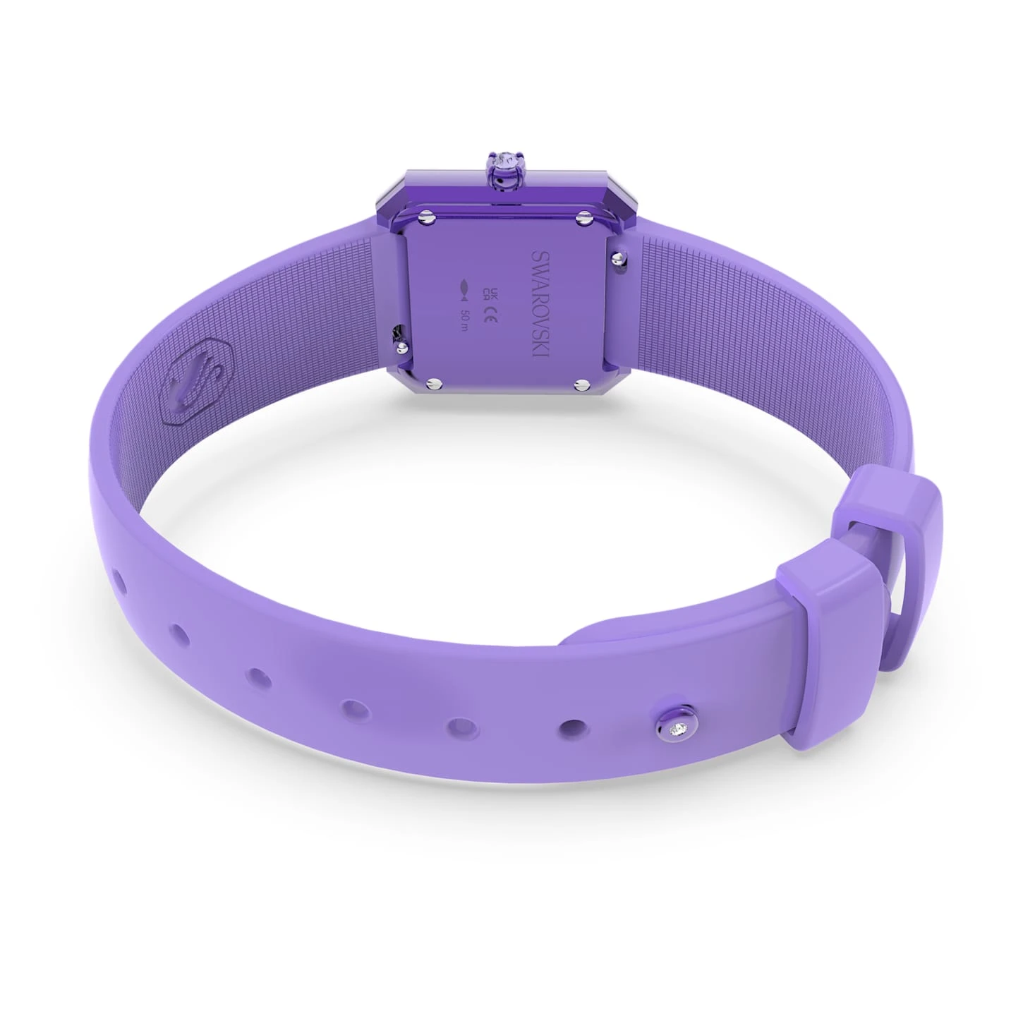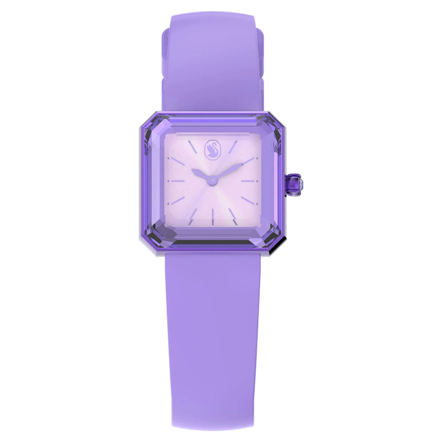 Make a playful, everyday statement with this unique watch. Featuring a faceted, sapphire glass centerpiece in a striking, purple hue, it comes with an opaque, silicone strap that can easily be swapped out for another – depending on your outfit or mood. The dial is intricately stamped with the Swan logo, while the case displays Swarovski’s wordmark on the reverse. Finished with a crystal-studded closure, wear yours to add a pop of dynamic color to any look. Specifications: Case – 25 x 25mm; water resistant to 50m. This watch is inspired by the Lucent Family.